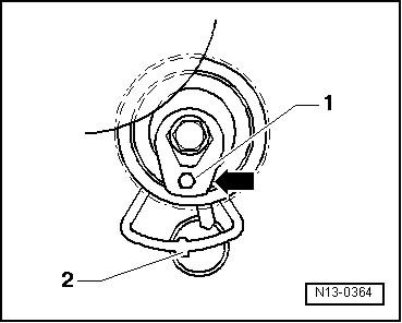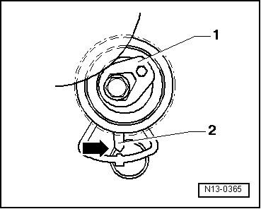 - За внутренний шестигранник -1- повернуть натяжной ролик привода между распредвалами по часовой стрелке в направлении маркировочного окна -стрелка-, (ролик в положении, соответствующем ненатянутому ремню);