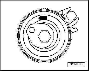 - Повернуть натяжной ролик основного привода ГРМ за внутренний шестигранник против часовой стрелки в указанное положение -стрелка-;