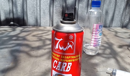 С помощью чистого второго шприца (второй используем так как в первом растворитель мог повредить резинку на поршне и ухудшить его работу) закачаем необходимое количество воздуха. Закачиваем пока он перестанет туда вдавливаться, а жидкость начнет в большом количестве выходить из баллончика.