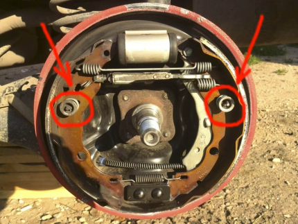 Теперь надо открутить и снять чашки пружин опорных стоек колодок («солдатиков»). Под конец надо отвести верхнюю часть колодки от цилиндра, вынуть распорную планку, отцепить и снять нижнюю стяжную пружину, и отсоединить трос ручника. Снять тормозные барабанные колодки.