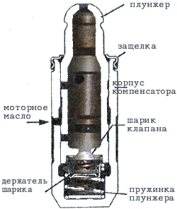 Устройство гидрокомпенсатора сложностью не отличается. Он состоит из корпуса, плунжера, клапана, пружины, поршня и стопорного кольца.