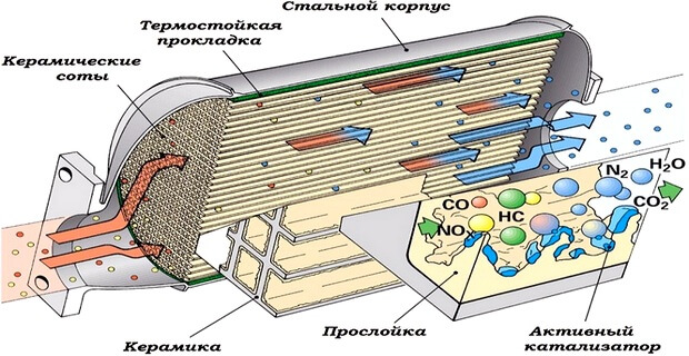 Автомобильный катализатор состоит из драгоценных металлов, благодаря которым происходит разложение вредных веществ до экологически чистых компонентов. Это корпус, внутри которого на металлическую или же керамическую сотовую основу наносят платиноиридиевый слой. Данный сплав помогает с помощью химических реакций разложить вредные оксиды азота и углеводороды до безвредных веществ.