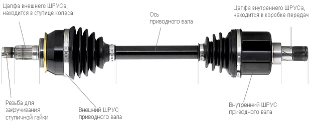 На переднеприводных автомобилях для передачи крутного момента от КПП к колесам устанавливаются полуоси несколько иной конструкции. Состоит такой приводной вал из оси, внутреннего и наружного ШРУСов.